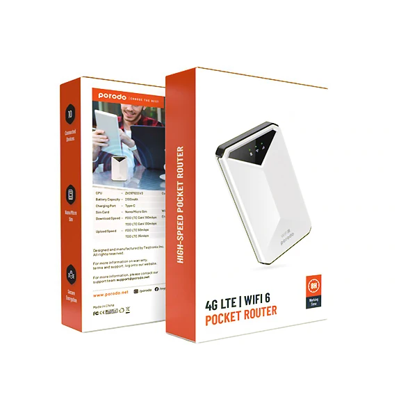 ویژگیهای مودم جیبی پرودو مدل WiFi ۶ PD-PT۴GRWD در ادامه به بررسی ویژگیهای برجسته این محصول میپردازیم: پردازندهی مرکزی قدرتمند: مودم پرودو مدل WiFi ۶ PD-PT۴GRWD به پردازندهی مرکزی ZX۲۹۷۵۲۰ V۳ مجهز شده است که باعث میشود عملکردی سریع و پایدار را در ارتباطات شبکهای تجربه کنید. این پردازنده قادر است به خوبی از پس پردازشهای سنگین شبکه برآید و اتصال اینترنتی با سرعت بالا را برای شما فراهم کند. قابلیت اتصال همزمان چندین دستگاه: این مودم امکان اتصال همزمان تا ۱۰ دستگاه را فراهم میکند. این ویژگی، آن را به گزینهای مناسب برای استفاده در سفرها، جلسات کاری و محیطهای خانگی تبدیل میکند. شما و خانوادهتان میتوانید بهطور همزمان از اینترنت با کیفیت و بدون اختلال بهرهمند شوید. منبع تغذیه قوی و کارآمد: یکی از ویژگیهای برجسته این مودم، باتری داخلی ۲۱۰۰ میلیآمپر ساعتی آن است که با هر بار شارژ، حدود ۸ ساعت کارایی را برای شما تضمین میکند. با این قابلیت، دیگر نگران تمام شدن شارژ باتری در حین استفاده نخواهید بود. پشتیبانی از باندهای گسترده ارتباطی: مودم پرودو مدل WiFi ۶ PD-PT۴GRWD از باندهای مختلف LTE FDD و TDD پشتیبانی میکند. این موضوع به شما امکان میدهد تا در مناطقی با پوشش متفاوت شبکه، همچنان از اینترنت پرسرعت بهرهمند شوید. باند وایرلس ۲.۴GHz با تکنولوژی WiFi ۶ نیز تجربهای بهینهتر و پایدارتر را در اتصال بیسیم ارائه میدهد. سرعت دانلود و آپلود عالی: این مودم با سرعت دانلود ۱۵۰mbps در FDD LTE و ۱۳۰mbps در TDD LTE و همچنین سرعت آپلود ۵۰mbps در FDD LTE و ۳۵mbps در TDD LTE، تجربهای بینظیر از اینترنت پرسرعت را برای شما فراهم میکند. این سرعتها به شما اجازه میدهد تا بدون وقفه و با کیفیت بالا به فعالیتهای آنلاین خود بپردازید. امنیت پیشرفته با رمزگذاری مدرن: امنیت اطلاعات در این مودم به لطف پشتیبانی از پروتکلهای رمزگذاری پیشرفته مانند WPA۲-PSK و WPA۳ تضمین شده است. این رمزگذاریها، حفاظت از دادههای شما در برابر تهدیدات احتمالی را فراهم میکنند.