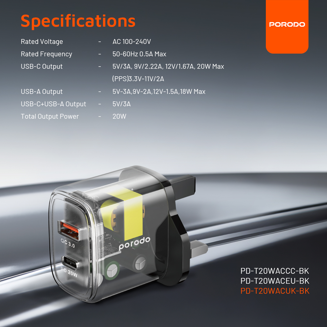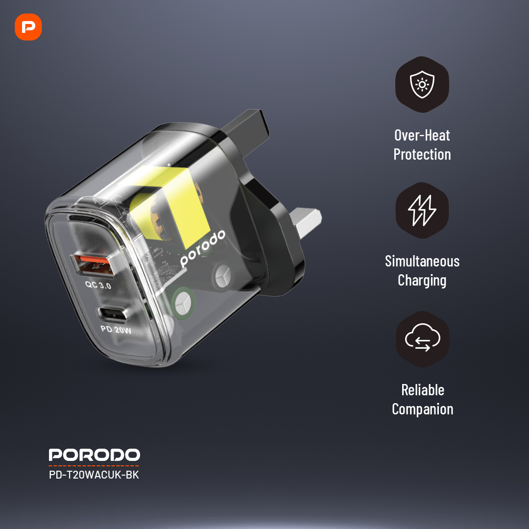 شارژر دیواری 20W پرودو مدل Dual Output Transparent یک ابزار جانبی پیشرفته و بسیار کاربردی است که با طراحی شفاف و پلاگین استاندارد بریتانیایی تولید شده است. این شارژر به شما امکان میدهد تا دستگاههای خود را با کارایی بیشتر و ایمنی بالاتر شارژ کنید. با توجه به پشتیبانی از دو پورت خروجی USB-C PD و USB-A QC، این شارژر توانایی ارائه توان خروجی 20 وات را دارد و میتواند بهصورت همزمان دو دستگاه را شارژ کند. از ویژگیهای برجسته این محصول میتوان به حفاظت در برابر گرمای بیش از حد اشاره کرد که از آسیب رسیدن به دستگاههای شما جلوگیری میکند. طراحی شفاف این شارژر، علاوه بر زیبایی و جذابیت، به شما امکان میدهد تا به بخشهای داخلی دستگاه نگاهی بیندازید و از تکنولوژی بهکاررفته در آن مطلع شوید.